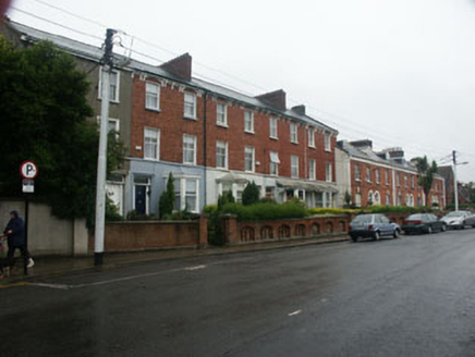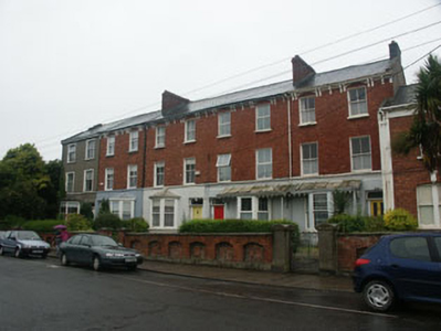 Terraced two-bay three-storey house, built in 1865 as part of a group of five similar properties. The façade is finished in painted render to the ground floor level, with the upper floors in brick. To the ground floor there is a canted bay window. The slated pitched roof has an overhang supported on decorative brackets, and a shared brick chimneystack. The entrance consists of a panelled timber door with pilaster jambs and rectangular fanlight with shaped upper corners. The windows are flat-headed and have replacement uPVC frames. The bay window shares a single-pitched lead covered roof with the bay window of the neighbouring property. This roof, which is partly supported on timber brackets, has a decorative ‘eaves’ detailing. Cast-iron rainwater goods. The house fronts on to a roadside but is separated from it by a small garden enclosed by a brick wall with arched recesses, rendered coping, and a shared wrought-iron gate with rendered piers.