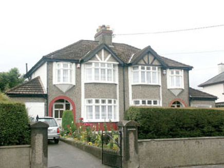 Matching semi-detached pair of two-bay two-storey houses, built c.1935, with contemporary single storey garages. The façade of each property is largely covered in pebbledash with a brick and render base and a small gabled area of mock timber framing. The roofs are hipped and covered in pan tiles and the properties share a rendered chimneystack with brick corbelling. To the front elevation of each is a full-height canted bay topped with a gable, and beside this at first floor level there is a small oriel window. The entrance is located within a recessed porch with brick-dressed semi-circular headed opening, and consists of a timber and glazed door with large sidelights and fanlight. The windows are flat-headed and have timber mullioned and transomed frames. The ground floor bay window to the front elevation of both houses has coloured glazing. The property to the east side has retained its hipped roof garage with its timber double door whilst its neighbour’s garage has been converted to provide extra living space. Cast-iron rainwater goods. The houses face onto a street but are separated from it by gardens enclosed by a roughcast walls and hedges.