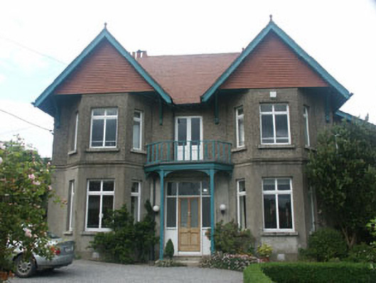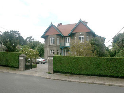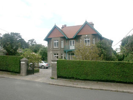Detached three-bay two-storey house, in typically Edwardian eclectic style, built c.1900. The building is roughly square in plan but with a full-height lean-to projection to the east elevation. The south-facing front elevation is symmetrical with canted bays topped with overhanging gables, and a small timber balcony between the bays which forms a porch over the entrance. The façade is finished in unpainted lined render to ground floor with pebbledash above and tile cladding to the front gables. The tiled overhanging pitched roof has plain bargeboards with finials and rendered chimneystacks, with the front gables supported on curved timber brackets. The entrance consists of a timber panelled and glazed door with large rectangular fanlight and sidelights. A panelled and glazed timber double door opens on to the balcony. The windows are flat-headed and have timber mullioned and transomed frames. Cast-iron rainwater goods. The house is set at the side of a suburban street, but is surrounded by a relatively large garden enclosed by a hedge.