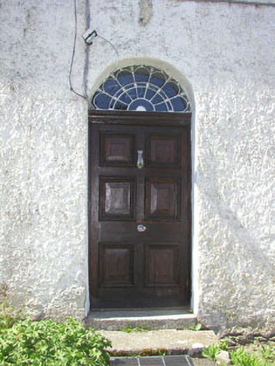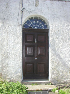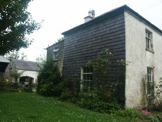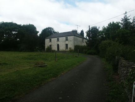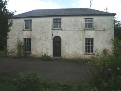 Detached three-bay two-storey house, built c.1780. The façade is finished in painted roughcast, with slate cladding to part of the south elevation and plain painted render to a small lean-to section to the rear. The hipped roof is slated and has rendered chimneystacks. The entrance consists of a panelled timber door and semi-circular fanlight with ‘petal’ tracery. The windows are flat-headed with most filled with timber sash frames, six over six and three over three, with c.1980s replacement timber frames to some windows to the south and rear elevations. uPVC rainwater goods. Outbuildings to west.