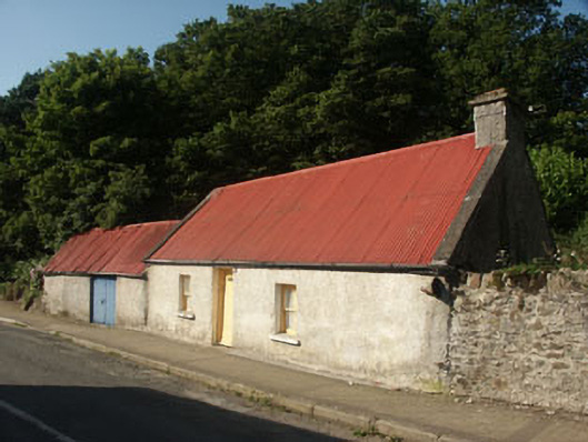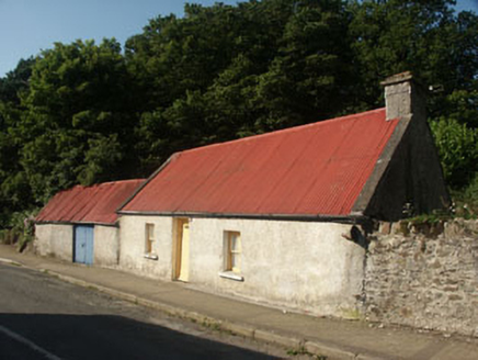 Detached three-bay single-storey house, built c.1800, with attached single-bay outbuilding to the west. The façade is finished in unpainted roughcast and unpainted plain render whilst the gable-ended pitched roof is covered in corrugated-iron and has a rendered parapets and a rendered chimneystack. The entrance consists of a timber tongue and groove door and the small flat-headed windows have two over two timber sash frames. The outbuilding (whose roofline is lower than the house) has a large doorway with timber tongue and groove double door. Metal rainwater goods. The house has a road frontage.