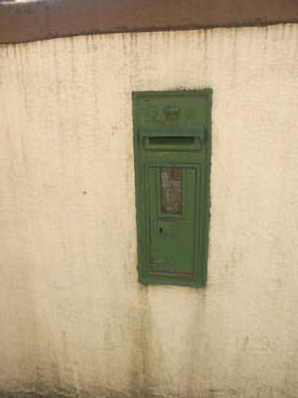 Wall-mounted cast-iron post box, dating from c.1885. The box has the moulded royal monogram ‘V R’ with crown in between, and is now painted green.