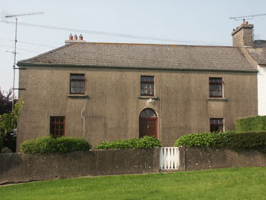 End-of-terrace three-bay two-storey former estate worker’s house, built c.1820 and now in use as a private house. It was built for the Coolattin estate and is one of a terrace of thirteen houses. The house is rendered. The panelled door and radial fanlight are set within a semi-circular arched opening. Window openings are flat-headed and have three over six top-hung replacement timber windows. The hipped roof is finished with artificial slate and has uPVC rainwater goods. Chimneystacks are rendered with slightly corbelled caps and clay pots. The house faces the road. It is slightly set back behind a low rendered wall with square gate pillars and a replacement wrought-iron gate. There is a tarred footpath directly outside the gate and this is all well set back from the road behind a small green.