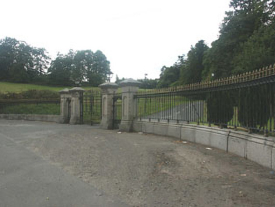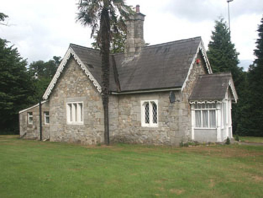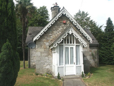 Detached two-bay gable-fronted single-storey former gate lodge, built c.1835. The house is constructed in granite rubble. The panelled front door is set within a gabled glazed timber porch. Window openings are generally flat-headed and some have chamfered corners. Glazing to the main house has diamond panes while the porch has plain fixed frames, and the rear addition has modern top-hung frames. The pitched roof is finished with natural slate and cast-iron rainwater goods. The chimneystack is ashlar granite with boldly corbelled cap and clay pots. The building is set immediately behind a large curved gate screen. This has paired granite gate pillars which are square and have pyramidal caps. The railings are cast-iron and are set on low granite walls and there are matching cast-iron gates.