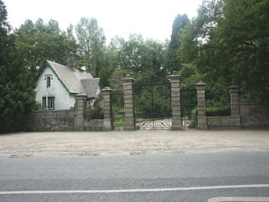 Detached three-bay one and a half-storey gate lodge, built c.1840. The house is finished in render with some moulded dripstones. The front door is set within a projecting open gabled porch with pointed arched head. Window openings are flat-headed with mainly casement timber windows. To the north gable there is an oriel window to the ground floor. The roof is finished with chamfered natural slate with cast-iron rainwater goods; overhanging eaves have decorative bargeboards. The tall chimneystack is in brick. The lodge is slightly set back from a wide curved gate screen. The gates and railings are in decorative wrought-iron. Coach gates, pedestrian gates and side railings are all framed by square pillars with panelled rusticated granite blocks. The outer pillars are smaller.