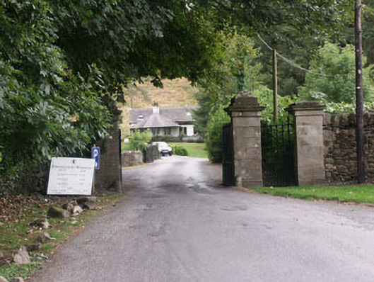This picturesque-style gate lodge, known as "Waterfall Lodge" owing to its siting at the entrance to Powerscourt Waterfall, is complete and has retained its gate screen.