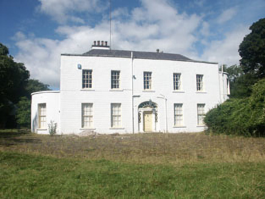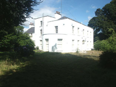 Detached five-bay part one part two and part three-storey country house, built c.1800. The east front is finished in painted vertical hung slate while the remainder is finished in render. There are later additions to the west rear. To either side there are flat-roofed semi-circular bays, that to the north is two-storey while that to the south is single-storey. The front timber panelled door is flanked with pilasters with Ionic order capitals, these support a projecting cornice over which is a radial fanlight set within an elliptical-headed opening. On either side are sidelights with diamond panes. Window openings are flat-headed with six over six timber sash frames. The hipped roof is finished with natural slate and has cast-iron rainwater goods. Chimneystacks are rendered with plain caps and clay pots. The country house is set within a large mature garden.