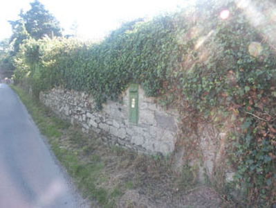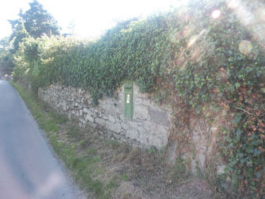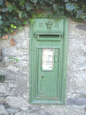 Wall-mounted cast-iron fronted post box of c.1905 with Edward VII monogram; now painted green.