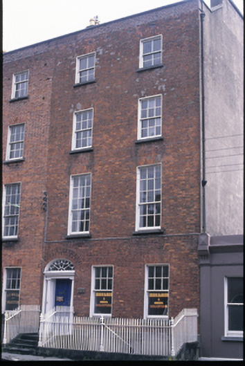 End-of-terrace two-bay four-storey over basement Georgian-style former townhouse, built 1832, now in use as office. Built as part of a terrace of six houses. Pitched slate roof with stone coping to parapet. Red brick walls. Plastered walls to gable. Timber panelled door flanked by engaged fluted columns with moulded lintel and wrought-iron cobweb fanlight above. Timber sliding sash windows. Flight of limestone steps leading to entrance door. Cast-iron railings to steps and basement area. Yard to rear.