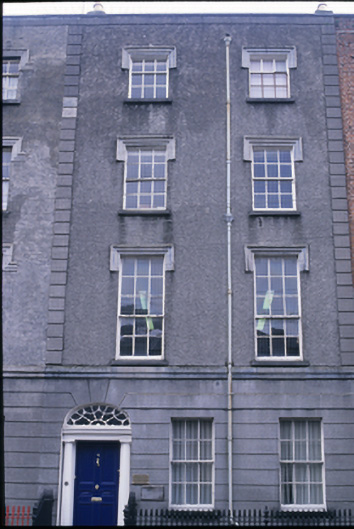 Terraced two-bay four-storey over basement Georgian-style former townhouse, built 1832, now in use as office. Built as part of a terrace of six houses. Pitched slate roof with downpipe to centre of facade. Channelled render walls to ground floor. Roughcast rendered walls to upper floors with render quoins. Timber panelled door flanked by engaged fluted columns with moulded lintel and wrought-iron cobweb fanlight above. Timber sliding sash windows with moulded lintels to upper floors. Flight of limestone steps leading to entrance door. Cast-iron railings to steps and basement area. Yard to rear.