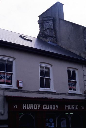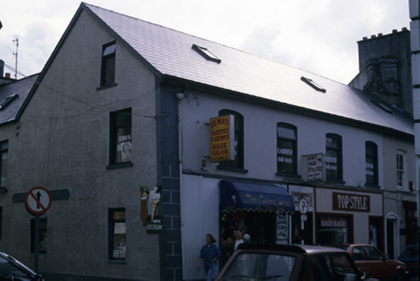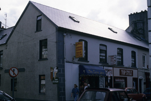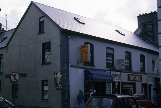 Corner-sited five-bay two-storey former house with attic accommodation, built c. 1650, now in use as commercial outlets. Pitched artificial slate roof with rooflights. Very fine diagonally placed stone chimneystacks. Coping stone line in stacks indicates roof pitch has been lowered. Rendered and roughcast rendered walls with slight kink to front façade. Walls appear very thick. Segmental-arched openings to first floor, with replacement timber sash and casement windows. Square-headed openings to ground floor with various replacement fittings. Late nineteenth century shopfront comprising fixed windows with central glazing bar and glazed spandrels, flanked by pilasters and with cornice above.