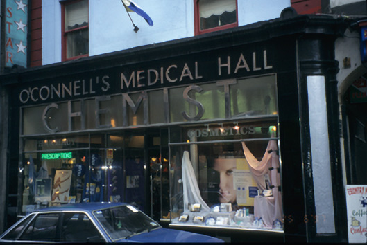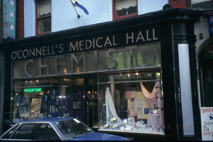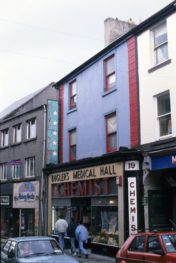Terraced two-bay three-storey former house, built c. 1800, as a pair with the adjoining house. Now in use as retail outlet. Pitched slate roof with rendered chimneystack. Rendered walls with render quoins. Late nineteenth century projecting shopfront with curved end and moulded cornice. Chrome framed fixed windows and lettering inserted to shopfront c. 1940. Timber sliding sash windows set in moulded architraves.