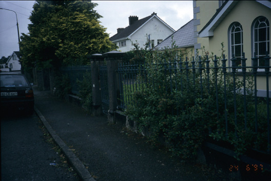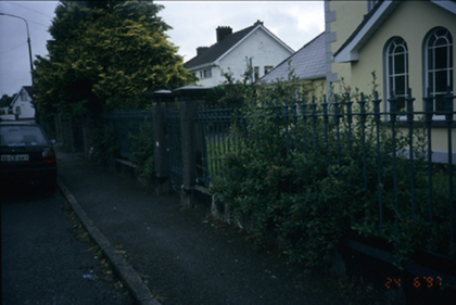 Chamfered-edged gate piers with cast-iron railings on cut-stone chamfered-edged plinth, erected c. 1875. Set in front of house.
