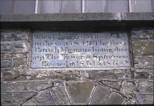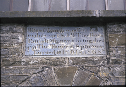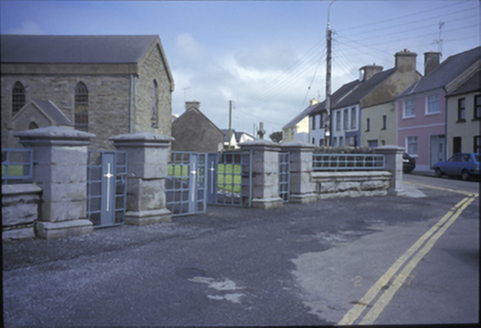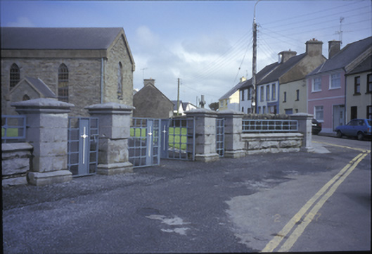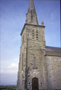Freestanding cruciform-plan double-height Roman Catholic church, built 1839, comprising three-bay side elevations and single-bay transepts with three-stage entrance tower added in 1861, and broach spire added in 1863. Porches added to transepts. Pitched artificial slate roof. Pinnacles and cut-stone spire with lucarnes to tower. Concrete eaves banding, c. 1985. Rubble stone walls with cut-stone quoins and inset plaque. Diagonal buttresses, cut-stone string course and dentillated cornice to tower. Four-centred arch door opening. Lancet windows with cut-stone architraves and replacement timber window. Leaded stained glass windows to porch. Retaining interior features including cast-iron spiral staircase, gallery to rear, clustered columns, Tuscan timber columns to galleried transepts, tiled central aisle and coffered ceiling. Pair of freestanding cut-stone stoups and cut-stone piers with moulded pyramidal capping to site.