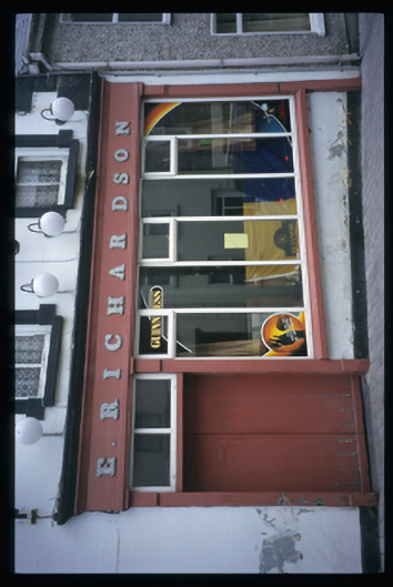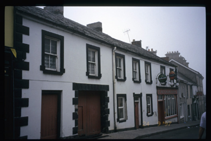 Terraced seven-bay two-storey house, built c. 1850, with square-headed integral carriage arch to left hand side. Timber shopfront inserted, c. 1900. Pitched slate roof with brick and concrete block chimneystacks and cast-iron downpipe. Lined-and-ruled rendered walls with rusticated render quoins and raised render surrounds to openings. Shopfront comprising pilasters flanking replacement display window and timber matchboard double leaf doors with overlight, having fascia, marbleised lettering and moulded cornice above. Timber matchboard doors and timber sliding sash windows to openings.