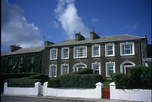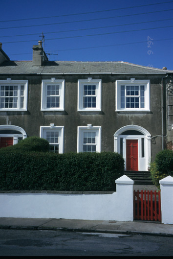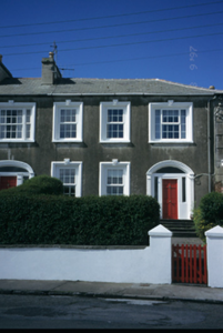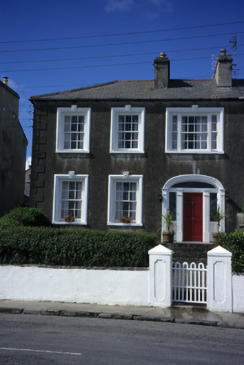 Pair of semi-detached three-bay two-storey houses, built c. 1820. Hipped slate roof with rendered chimneystacks. Rendered walls with render quoins and moulded render surrounds with keystones to openings. Segmental-arched door openings having timber pilaster doorcases, timber panelled doors, fanlights and sidelights. Tripartite windows over doors. Timber sliding sash and replacement uPVC windows. Rendered boundary walls to site.