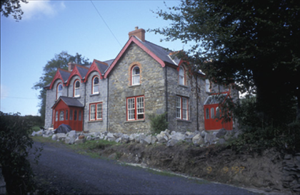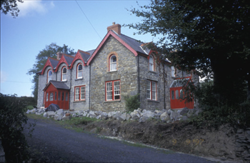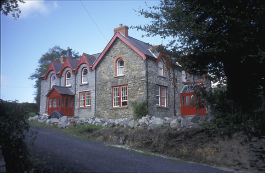 Detached three-bay two-storey house, built c. 1870, with three-bay two-storey extension to rear, c. 1995. Pitched artificial slate with red brick chimneystacks, gabled dormers having decorative timber bargeboards and wrought-iron finials. Exposed rubble stone walls. Paired timber sliding sash windows to ground floor. Round-headed openings with timber sliding sash windows to first floor. Timber panelled door with radial fanlight set in projected gabled glazed porch. Timber panelled shutters to interior. Rubble stone boundary walls and piers to site.