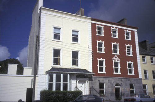 End-of-terrace two-bay three-storey house, built c. 1820, with bay window and canopy to ground floor. Rendered chimneystacks and moulded parapet to roof. Carved timber consoles to hipped canopy. Rendered walls with render quoins, decorative frieze to eaves and moulded render architraves to upper floor openings. Segmental-arched door opening having Ionic columns flanking timber panelled door with moulded lintel and fanlight above, approached by flight of steps. Replacement uPVC windows. Wrought-iron railings to site.