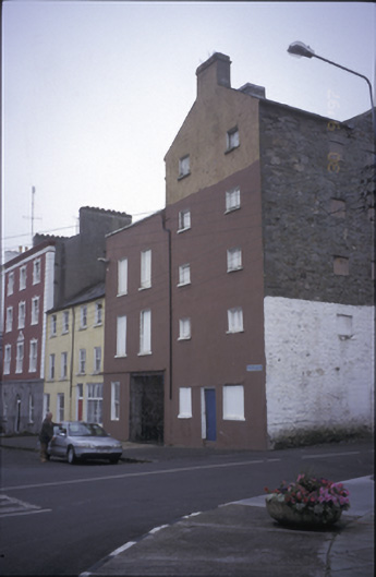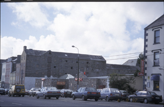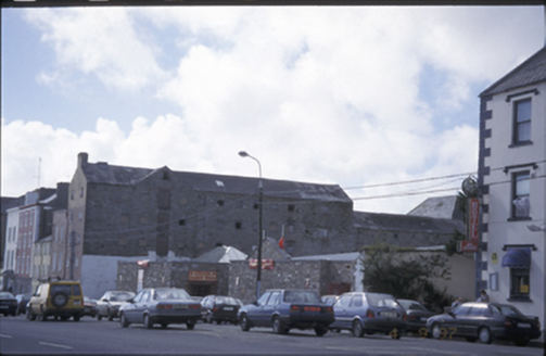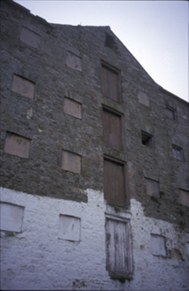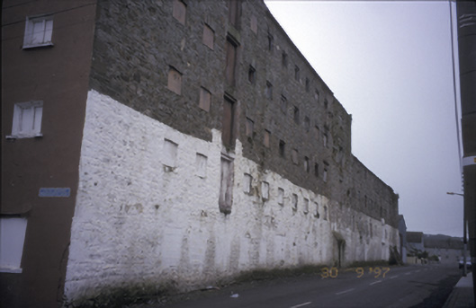Corner-sited attached gable-fronted two-bay five-storey former mill, built c. 1800, with twelve-bay side elevations having gabled loading bay and nine-bay four-storey return. Pitched slate roof with rendered chimneystack. Rendered walls to gable front, rubble stone walls to sides and rear. Blocked windows and timber doors.