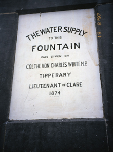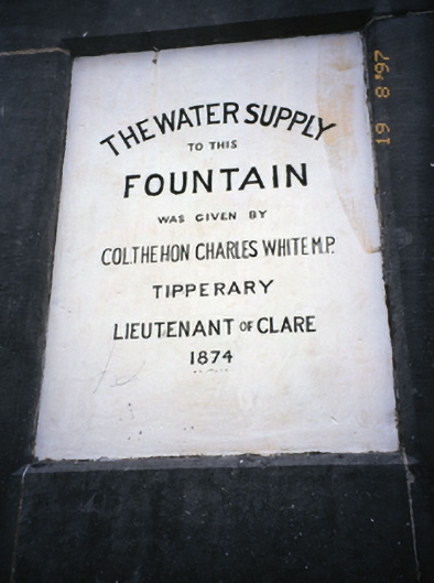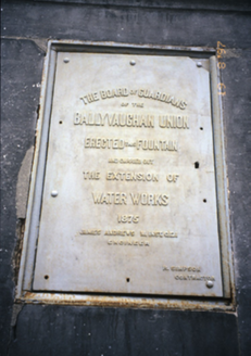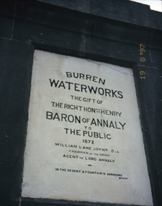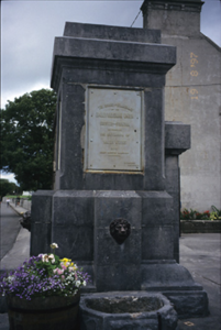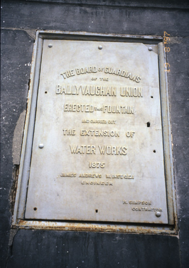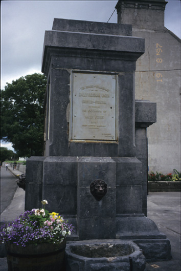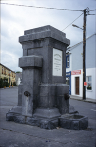 Freestanding public fountain, erected 1875, comprising carved limestone plinth and capped pedestal with inset plaques and cast-iron lion head spouts having troughs below. Plaques record the names of those involved in providing Ballyvaghan with one of the earliest reliable public water supplies in the country. The fountain was erected by two Connemara stonemasons, the Coyne brothers, who were marooned in Ballyvaghan when their craft sank at Gleninagh pier.