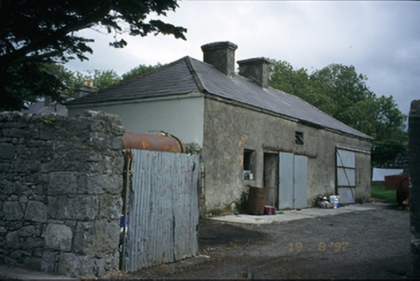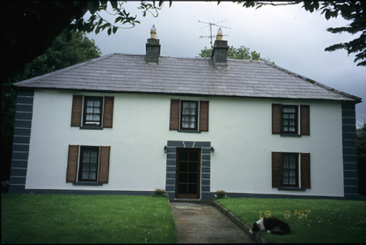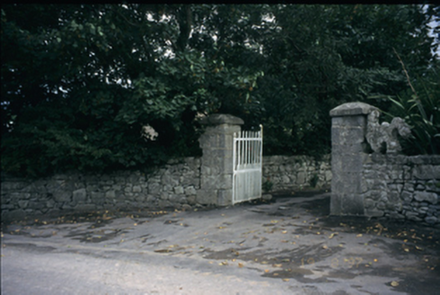 Detached three-bay two-storey house, built c. 1820, with two-bay single-storey extension to rear, c. 1985. Hipped slate roof with cut-stone chimneystacks. Rendered walls with render quoins and render surround to entrance door. Timber sliding sash windows with external shutter additions. Replacement timber panelled door. Detached four-bay single-storey outbuilding with half-dormer attic to site. Cut-stone piers having cast-iron gates and stile.