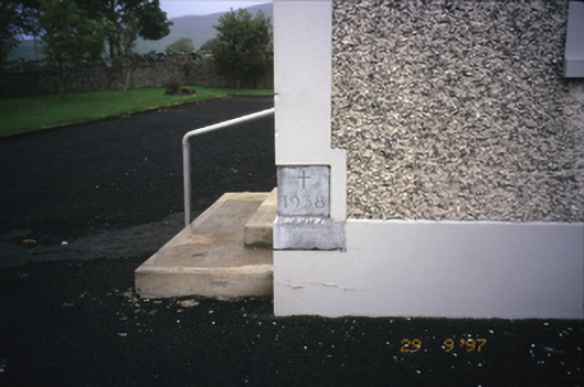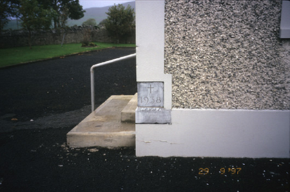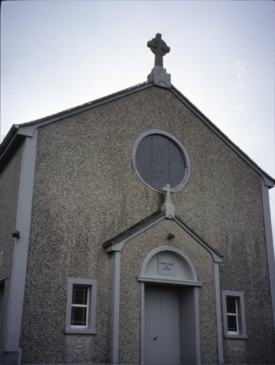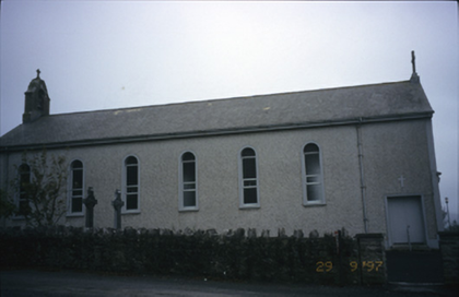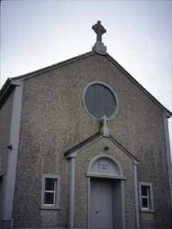 Freestanding gable-fronted double-height Roman Catholic church, built 1938-39, with six-bay nave elevation. Pitched slate roof with rendered bellcote and cross finial. Roughcast rendered walls with render plat bands and surrounds to openings, and inscribed foundation stone. Breakfront gabled porch with cross finial and round-headed door opening. Recessed timber matchboard double leaf doors with blank fanlight and plaque above, flanked by square-headed replacement windows and having stained glass oculus above. Round-headed openings with replacement windows. Retaining interior features including arched chancel screen, organ loft with panelled timber balustrade, exposed roof timbers and marble memorial from earlier church. Statue of Blessed Virgin Mary and kneeling children to site. Rubble stone boundary walls with crenellated copings and cut-stone piers.