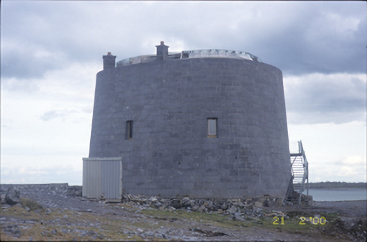 Freestanding single-bay two-stage over shallow basement Martello tower, built 1810-2, on an ovoid plan. Decommissioned, 1863. Sold, 1987, to accommodate alternative use. Flat topped glazed roof on skeletal frame behind parapet. Repointed limestone ashlar battered walls on submerged plinth with cut-limestone coping to parapet. Square-headed openings with limestone ashlar voussoirs. Square-headed machicolated door opening (south-east) approached by flight of engineered mild steel steps with limestone ashlar voussoirs. Interior including battalion room with red brick header bond vaulted ceiling springing from limestone ashlar battered pillar. Set in field. NOTE: Aughinish Point Martello Tower and Finavarra Point Martello Tower (see 20400205) were erected to defend and protect the south flank of Galway Bay and, unlike their contemporaries on the east coast of Ireland, display ovoid plans and mountings for three cannons on trefoil-plan platforms which, from the air, resemble shamrocks. Aughinish Point Martello Tower and Finavarra Point Martello Tower were 'dismantled…the guns, stores, and artillerymen withdrawn…the buildings taken possession of by the Barrack Department' when, following an inspection, 'it was found [the] towers were manned, armed, and kept in a state of repair at great expense to the public [despite being] quite incapable of rendering the slightest service, either offensive or defensive' (The Queensland Times 28th November 1863, 3).