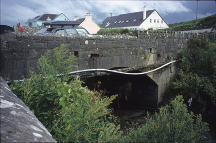 Single-arch coursed limestone road bridge over river, built c. 1850, with cut-stone voussoirs.