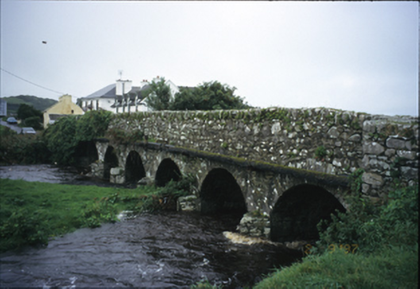 Six-arch rubble stone road bridge over river, built c. 1810, with cut-stone voussoirs and cutwaters.