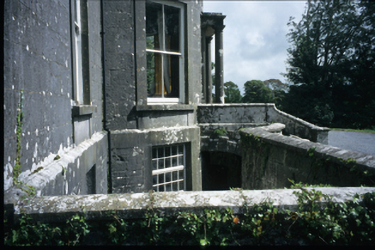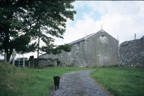 Detached five-bay two-storey over basement country house, built c. 1800, with three-bay full-height bowed central section front and rear elevations. Hipped artificial slate roof with rendered chimneystacks and moulded eaves course. Cut-limestone walls with raised architraves, aprons to ground floor windows and string course at sill level first floor of bow. Timber sliding sash windows. Tuscan columns flanking timber panelled door with simple entablature above. Curved cut-limestone walls to basement area and to steps leading to entrance. Retaining interior features. Four cast-iron chute covers to cellars with high relief motifs. Flagged basement area with cut-stone vaulted recesses in external retaining wall. Detached single-bay two-storey gable-fronted outbuilding with pinnacles and eight-bay side elevations. Detached four-bay single-storey byre with segmental-arched openings. Freestanding two-bay single-storey folly with lancet openings, now in ruins. Gateway to front comprising four cut-limestone piers and pair of square-headed pedestrian gates set in curved walls.