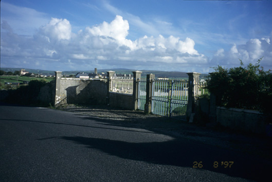 Detached three-bay single-storey gate lodge, built c. 1810, with gabled advanced central entrance bay. Hipped Moher flagged roof with rendered chimneystack. Rendered walls with label mouldings over openings. Paired timber sliding sash windows and timber panelled door. Canted bay window to side elevation. Gateway to front comprising eight cut-stone piers with curved walls and cast-iron gates and railings.