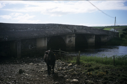 Triple-arch road bridge over river, built c. 1840. Irregularly coursed stone walls with cut-stone voussoirs, double-keystones, U-cutwaters, end piers and copings. Concrete pipes and casings to upstream side of bridge.