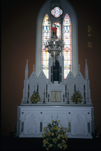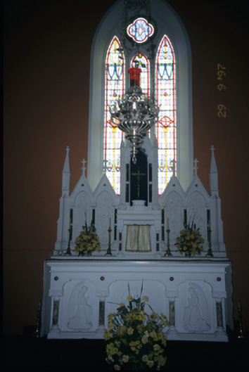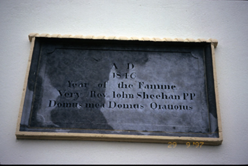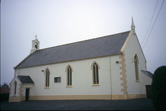 Freestanding double-height Roman Catholic church, date 1846, with four-bay side elevation, gabled porch to front and lean-to sacristy to side. Pitched slate roof with rendered bellcote, pinnacles, cut-stone gable copings, cast-iron rainwater goods and clay ridge cresting. Rendered walls with render quoins, hood mouldings and inset plaque. Lancet windows with timber Y-tracery and coloured glass. Timber doors. Retaining interior features, including exposed timber hammer beam roof and reredos.