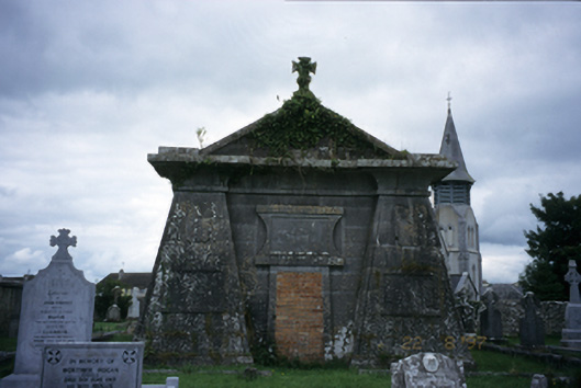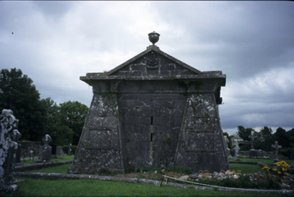 Freestanding gable-fronted single-bay single-storey limestone cut-stone neo-Egyptian-style mausoleum, built 1843, with three-bay side elevations, splayed corner piers, carved plaques, moulded cornice and finials over gables. Tomb of Sir Michael O'Loghlen, the first Catholic to be apponted Master of the Rolls.