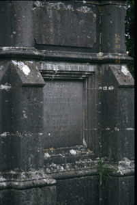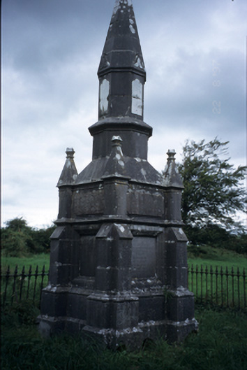 Freestanding single-bay single-storey mausoleum with memorial above, dated 1882. Cut-limestone walls with moulded cornice and shouldered door opening having cast-iron door. Memorial comprising square-profile base with stepped buttresses, pinnacles and inset plaques, having octagonal-profile shaft and conical cap above. Cut-stone piers and walls to site with cast-iron gates and railings.