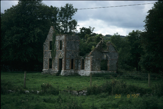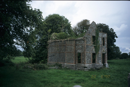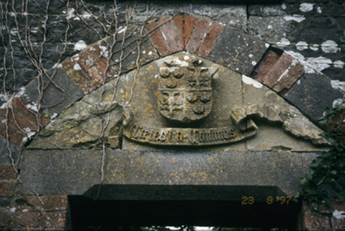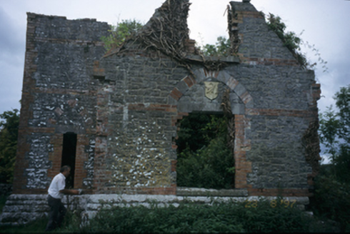 Detached L-plan three-bay single and two-storey house with dormer attic, dated 1861, comprising two-bay two-storey advanced block with gabled bay to left and entrance bay to right, and having recessed single-storey bay with dormer attic to right. Now in ruins. Snecked stone walls with rusticated stepped plinth, red brick quoins, string courses and dressing to openings. Chamfered cut-stone lintels to openings. Square-headed door opening having sandstone tympanum with crest and banner.