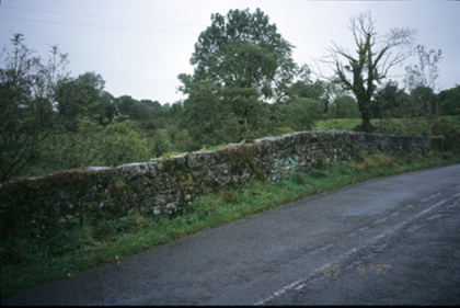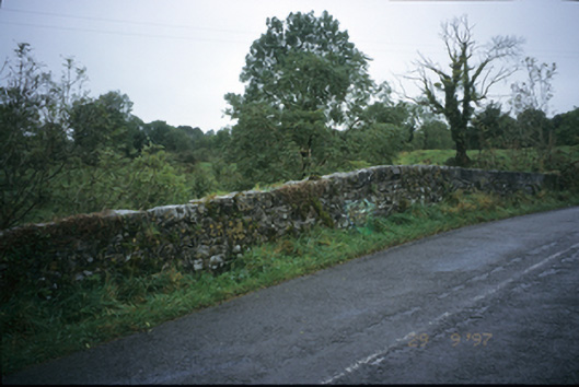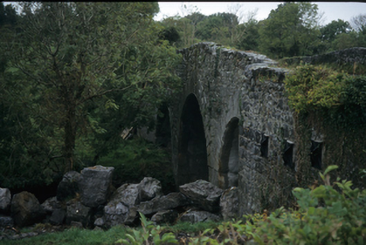 Triple-arch rubble stone hump-back road bridge over river Fergus, built c. 1800, with cut-stone voussoirs and V-cutwaters.