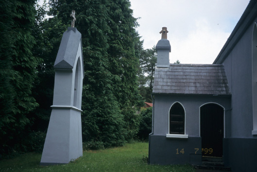 Freestanding gable-fronted double-height Roman Catholic church, opened 1884, with three-bay side elevations and two-bay single-storey sacristy to left. Pitched slate roof with ridge crestings and cross finials. Rendered walls. Lancet openings with pivot windows and Y-tracery. Blind arches flanking entrance with tripartite lancets above, repeating in miniature to apex. Blind tympanum over timber matchboard door. Retaining interior features including exposed timber roof beams, pierced timber frieze, carved reredos, panelled timber altar and granite font. Freestanding belfry to site.