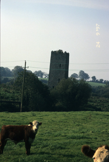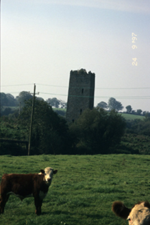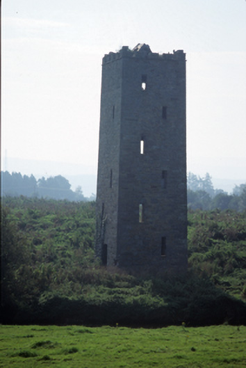 Freestanding two-bay six-stage rubble stone water tower, built c. 1860, with base batter, battlemented roof parapet and square-headed narrow openings. Now in ruins.
