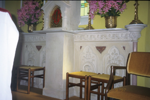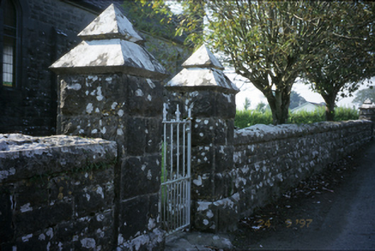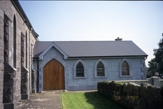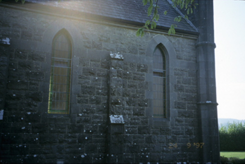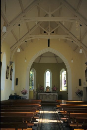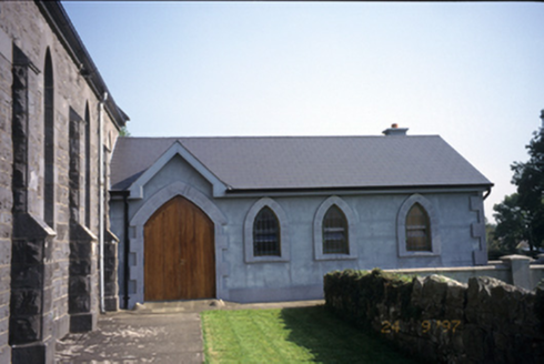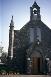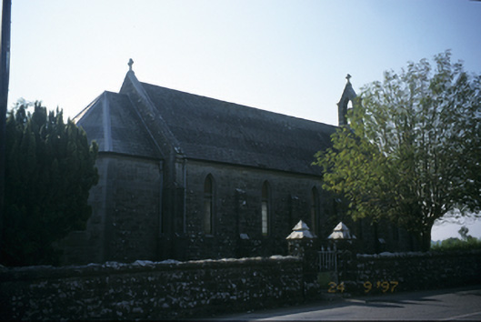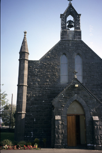 Freestanding gable-fronted double-height Roman Catholic church, built c. 1870, with advanced entrance porch, five-bay side elevations and chancel to rear. Four-bay single-storey projecting sacristy, added c. 1990. Pitched slate roof with fish scale pattern bands, cut-stone bellcote, copings and cross finials. Pitched artificial slate roof to sacristy. Snecked rusticated limestone walls with stepped buttresses and octagonal corner pinnacles to entrance front. Rendered walls to sacristy. Pointed arch openings with cut-stone block-and-start surrounds and leaded glass. Pointed arch door opening with timber matchboard double-leaf doors. Retaining interior features including carved altar and reredos. Cut-stone piers with pyramidal capping and cast-iron gate.