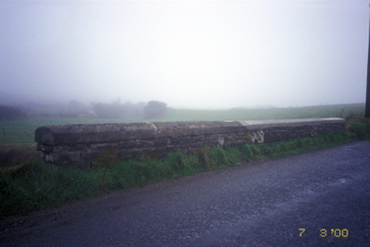Single-arch coursed stone road bridge over river, built c. 1820, with cut-stone voussoirs and inscribed benchmark.