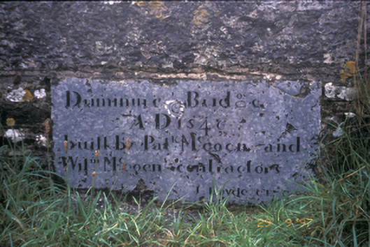 Single-arch rubble stone road bridge over river, dated 1846, with cut-stone voussoirs, piers and copings.