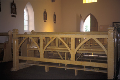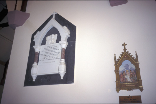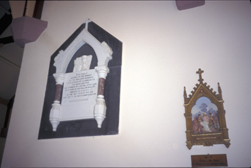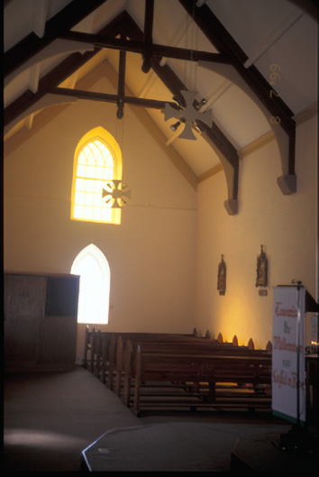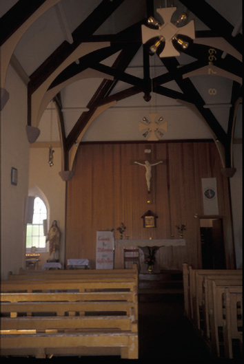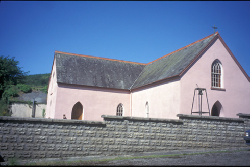 Freestanding T-plan gable-fronted double-height Roman Catholic church, built c. 1840, with single-bay nave and single-bay transepts. Pitched slate roof with metal cross finial and cast-iron rainwater goods. Rendered walls with inset fonts. Pointed arch openings with timber sliding sash windows. Timber matchboard doors. Retaining interior features. Rusticated concrete block boundary walls.