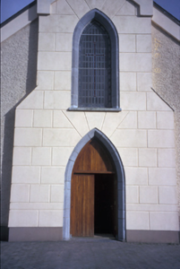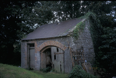 Freestanding T-plan gable-fronted double-height Roman Catholic church, built 1857 with stepped central breakfront and three-bay side elevations having single-bay transepts. Three-bay single-storey sacristy, added 1991. Pitched artificial slate roof with cross finial. Pebbledashed walls with lined-and-ruled render to breakfront. Lancet openings with leaded glass and timber matchboard double-leaf doors. Retaining interior features. Detached two-bay single-storey rubble stone coach house with segmental-headed carriageway, now derelict. Cut-stone piers and wrought-iron gates with crenellated boundary walls.