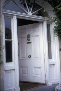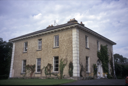 Detached L-plan three-bay two-storey house, built c. 1820, with recessed single-bay two-storey wing to right hand side. Hipped slate roof with dentilated eaves and rendered chimneystacks. Roughcast rendered walls with render quoins. Segmental-arched door opening with timber panelled door, flanking sidelights and radial fanlight. Timber panelled door. Retaining interior shutters. Group of detached two-bay single-storey outbuildings to site. Cut-stone piers with moulded capping having cast-iron gates and railings.