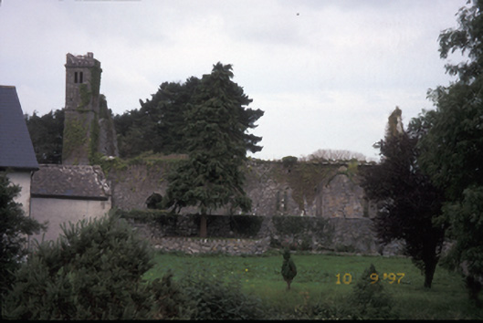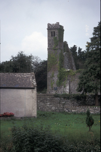 Remains of detached four-bay single-storey rubble stone single-cell church, dated 1278, with single-bay three-stage crenellated tower to left gable. Now in ruins. Rebuilt after destruction of earlier church by Thomas de Clare. Cut-limestone gate piers with string courses, copings and cast-iron gates.
