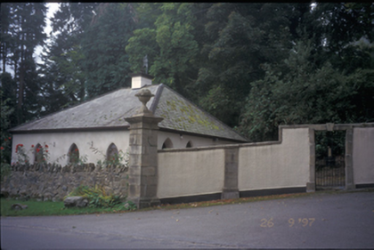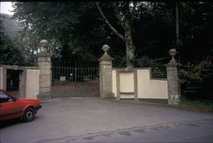 Gateway, built c. 1800, comprising four cut-stone piers with moulded cappings and ball finials set curved rendered walls having cut-stone copings. Square-headed pedestrian gates with cut-stone dressings and keystones. Wrought-iron gates. Detached three-bay single-storey gate lodge, built c. 1820, to left hand side. Hipped artificial slate roof with rendered chimneystack. Rendered walls. Lancet openings.