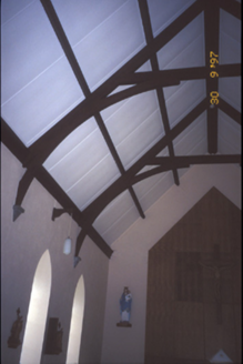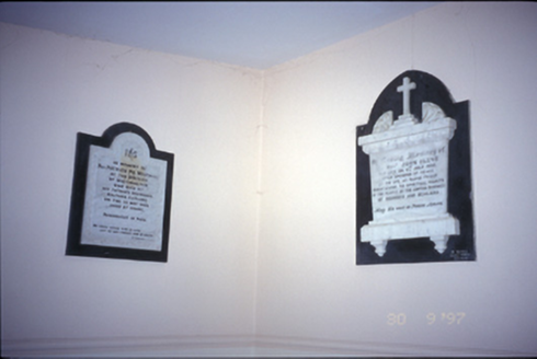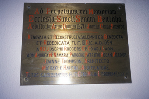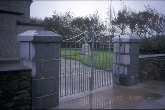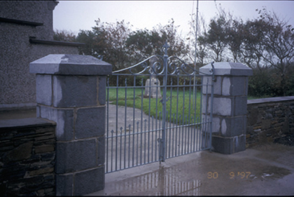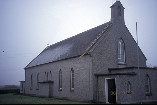 Freestanding gable-fronted double-height Roman Catholic church, built 1870, with five-bay side elevations having projecting confessionals. Three-bay single-storey flat-roofed porch added to front and single-bay single-storey flat-roofed sacristy added to rear, 1954. Pitched artificial slate roof with cut-stone gable copings, pebbledashed bellcote and cross finials. Pebbledashed walls. Pointed arch openings with leaded glass timber frame windows. Retaining interior features including exposed braced roof timbers on stone corbels, carved stone altar with high relief carvings and marble columns, raked choir gallery with timber balustrade and marble wall mounted memorials. Cut-stone piers with wrought-iron gates set in rubble stone walls.