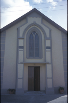 Freestanding gable-fronted double-height Roman Catholic church, built 1861, with stepped central breakfront and four-bay side elevations having single-bay transepts. Pitched artificial slate roof with timber sheeted eaves. Roughcast rendered walls with render quoins and render detailing having inset plaques to breakfront. Lancet openings with render surrounds and leaded glass. Cut-stone Y-tracery to window over entrance. Timber matchboard double leaf doors. Retaining interior features including raked gallery, pointed arch door with cusped panelling to sacristy door, exposed painted roof timbers on stone corbels, carved white marble reredos and altar. Roughcast rendered boundary walls.