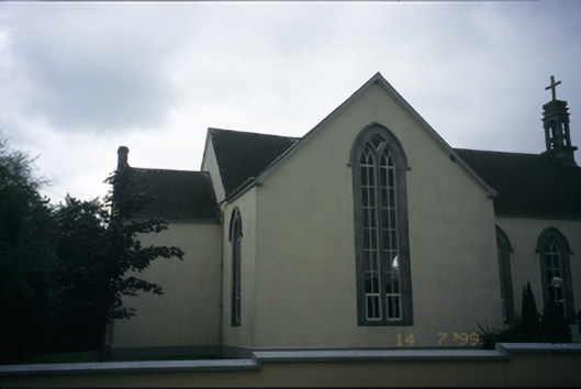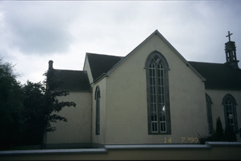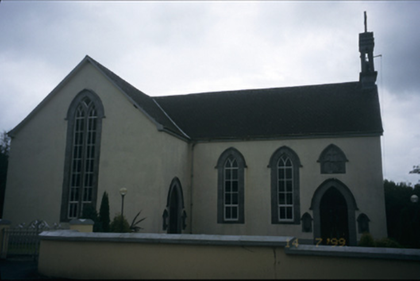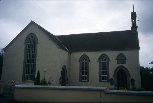 Freestanding cruciform-plan double-height Roman Catholic church, dated 1843, with three-bay nave, single-bay transepts and sacristy to rear. Pitched slate roof with cut-stone bellcote and cast-iron rainwater goods. Rendered walls with pairs of inset carved stone fonts flanking entrances and inset plaque with hood moulding over entrance door. Pointed arch openings with cut-stone architraves, hood mouldings, replacement windows and timber panelled double leaf doors. Retaining interior features. Wrought-iron gates set in rendered boundary wall.